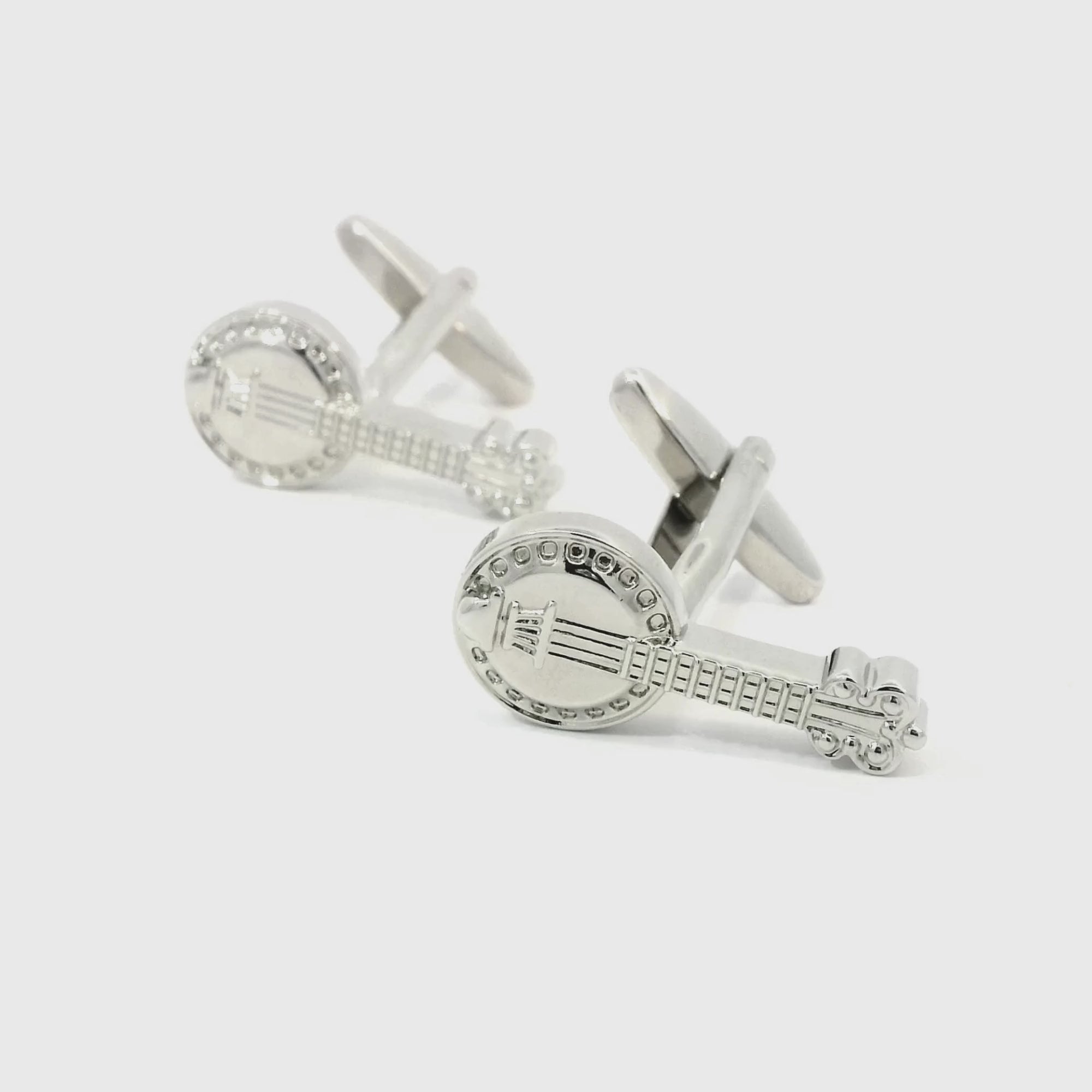 Deliverance on a sleeve! These beautiful Banjo Cufflinks feature intricate detailing and exceptional quality shown throughout, rhodium plated set on a strong swivel clasp. Add a touch of musical flair to any outfit with these novelty cufflinks, ideal for musicians and music enthusiasts alike, they're the perfect conversation starter and a thoughtful gift. Elevate your style with our Banjo Cufflinks and let your love for music shine.