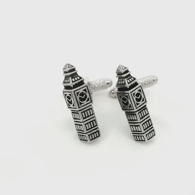 A timeless accessory that pays homage to the iconic landmark of London. Crafted with precision and attention to detail, these cufflinks feature a miniature replica of the famous clock tower with black detailing and are set in a silver bullet backing. These cufflinks are perfect for adding a touch of British charm to any formal ensemble. Whether you're attending a business meeting, a wedding, or a special event, these cufflinks are sure to make a statement and elevate your style.