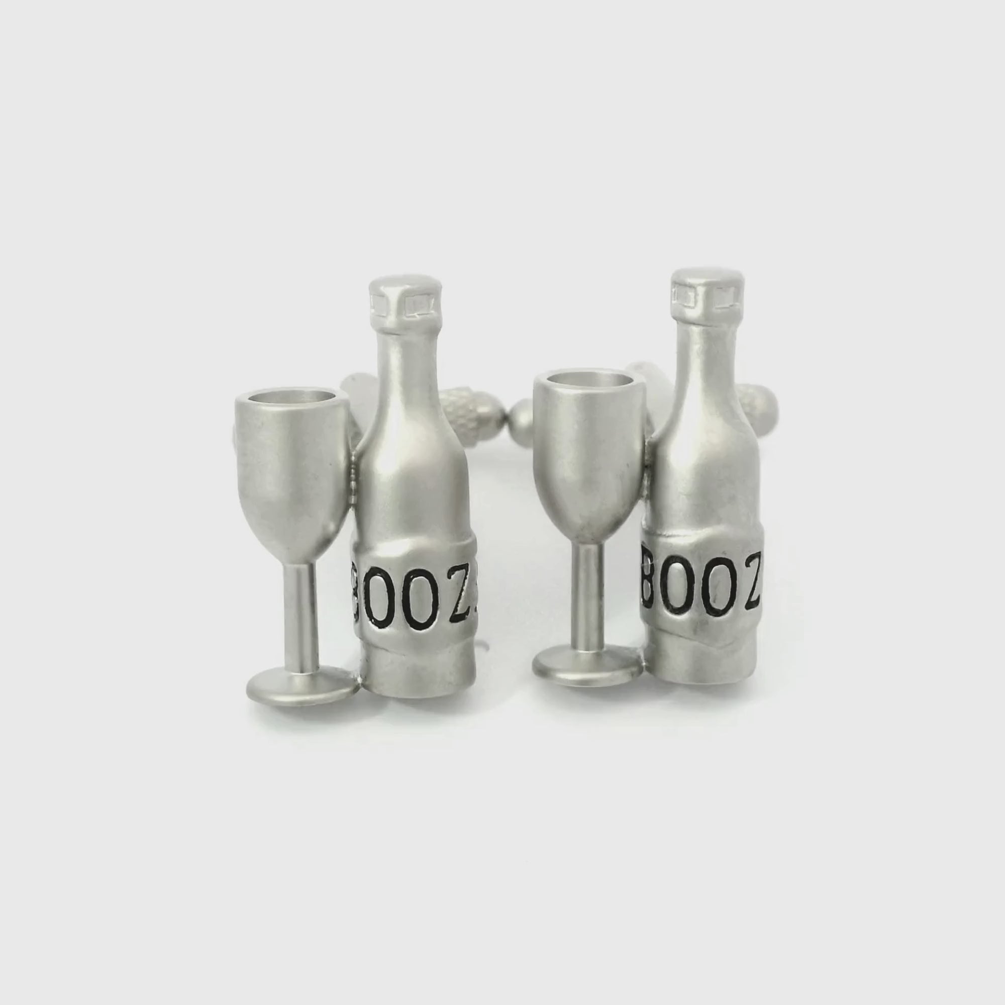 A nod to sophistication and a touch of indulgence. Crafted with precision and plated in silver, these cufflinks feature exquisite designs inspired by iconic symbols of celebration: a miniature bottle of booze and an elegant wine glass. Whether you're a wine aficionado or enjoy raising a toast with your favourite spirits, these cufflinks are the perfect accessory to showcase your discerning taste.