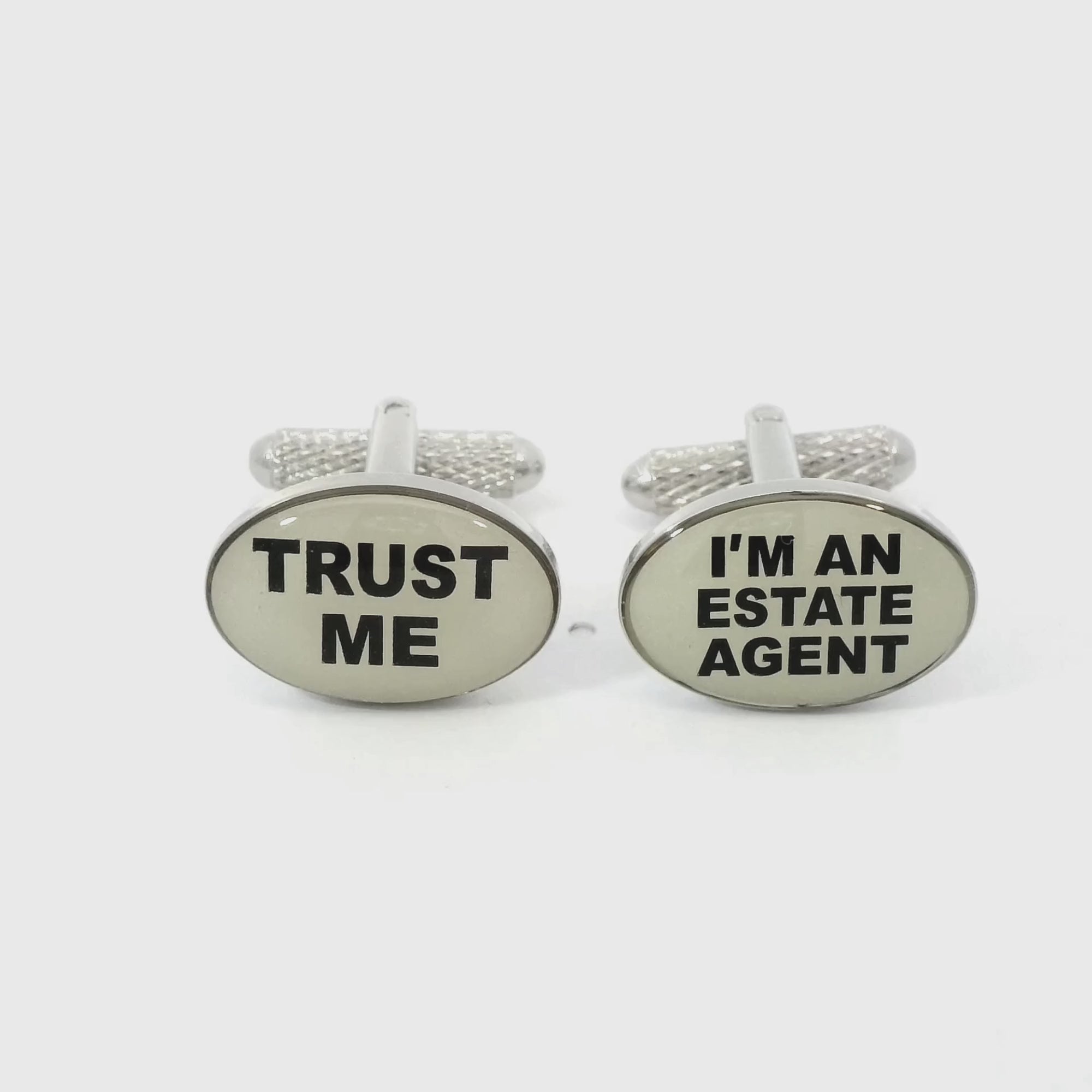 Introducing our Estate Agent Cufflinks, the perfect accessory for the distinguished professional in the real estate industry. These cufflinks feature white oval cufflinks with "Trust Me" on one cuff and "I'm an Estate Agent" on the other. Whether you're closing deals, attending property viewings, or networking at industry events, these cufflinks are sure to make a statement.