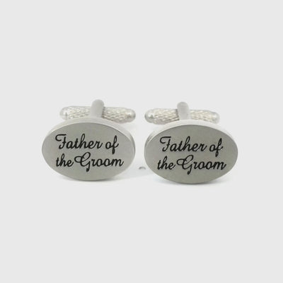 These elegant Father of the Groom Script Wedding Cufflinks are silver oval cufflinks beautifully inscribed with the words "Father of the Bride" in a graceful script font, making them a perfect accessory for one of life's most cherished occasions. The oval shape provides a classic and timeless look, while the delicate script adds a personal touch that is both meaningful and stylish.