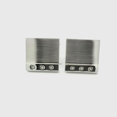 The Feature Bar cufflinks are made from a polished and brushed rhodium plate. These cufflinks have been uniquely designed to feature a polished bottom line with three round indentations joined to a brushed metal square. The quality is exceptional and because it is a classical looking cufflink it will go with any shirt and will never go out of style.