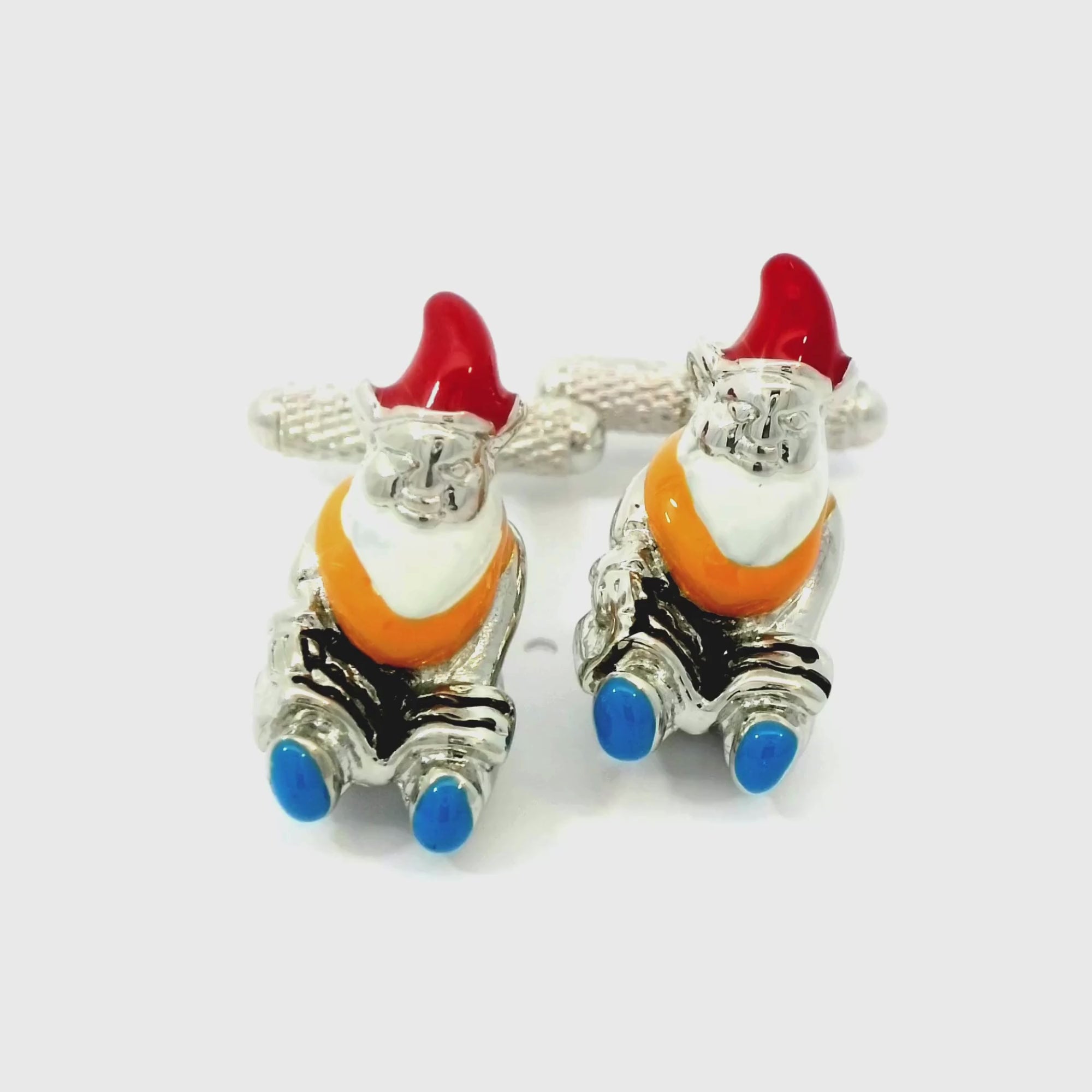 Introducing our Garden Gnome Cufflinks, these cufflinks feature a meticulously crafted sitting gnome, complete with its iconic pointed red hat, white jovial beard, orange shirt, and blue shoes. Each gnome is painted with vibrant colors to highlight its cheerful expression and detailed outfit. These Garden Gnome Cufflinks are sure to bring a smile and a bit of magic to your wardrobe.