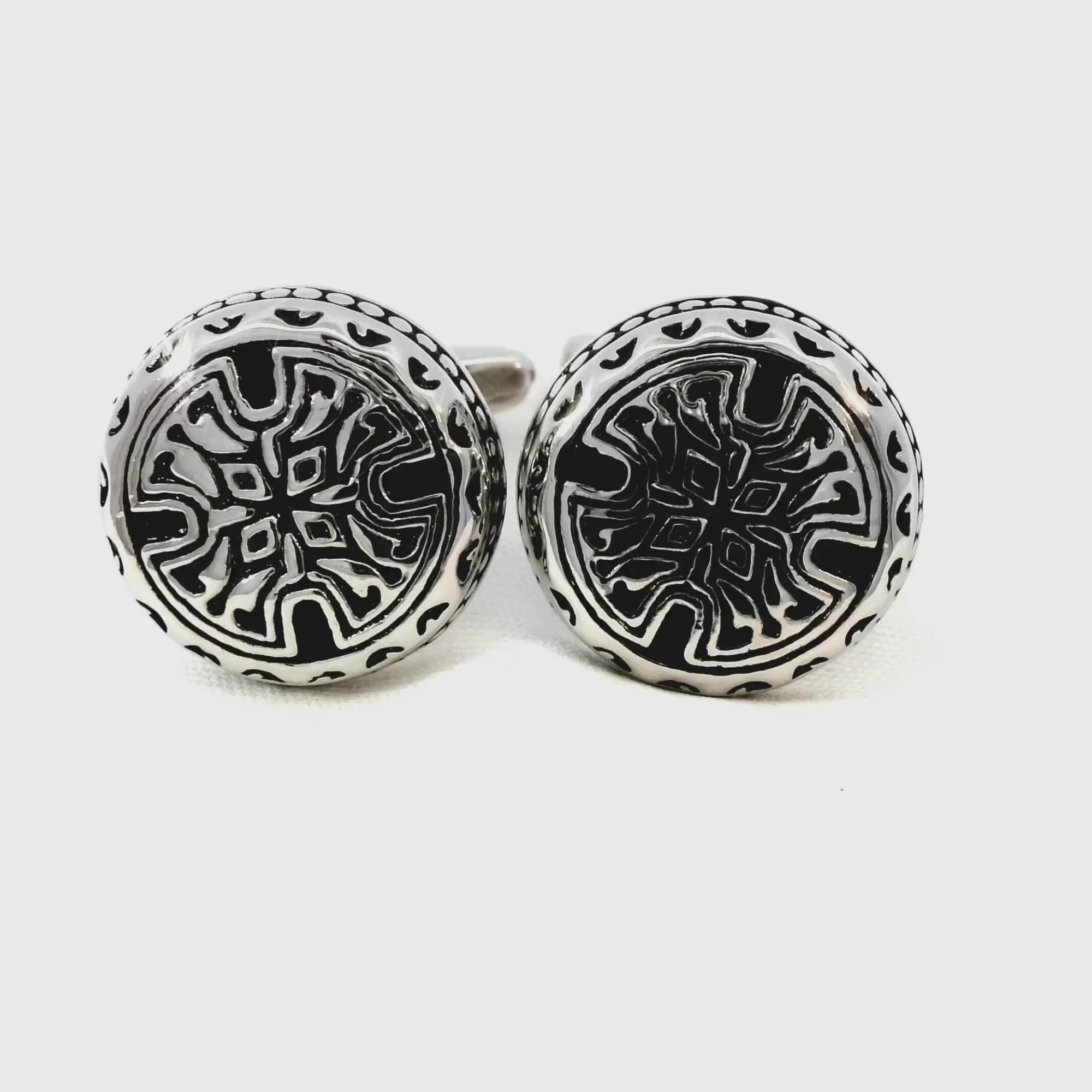 Introducing our Glenarvon Cufflinks. These cufflinks are crafted in a classic round shape, featuring ornate Gothic-style detailing in black and silver round cufflinks. Perfect for those who admire the Gothic aesthetic or wish to add a touch of historical elegance to their formal attire.