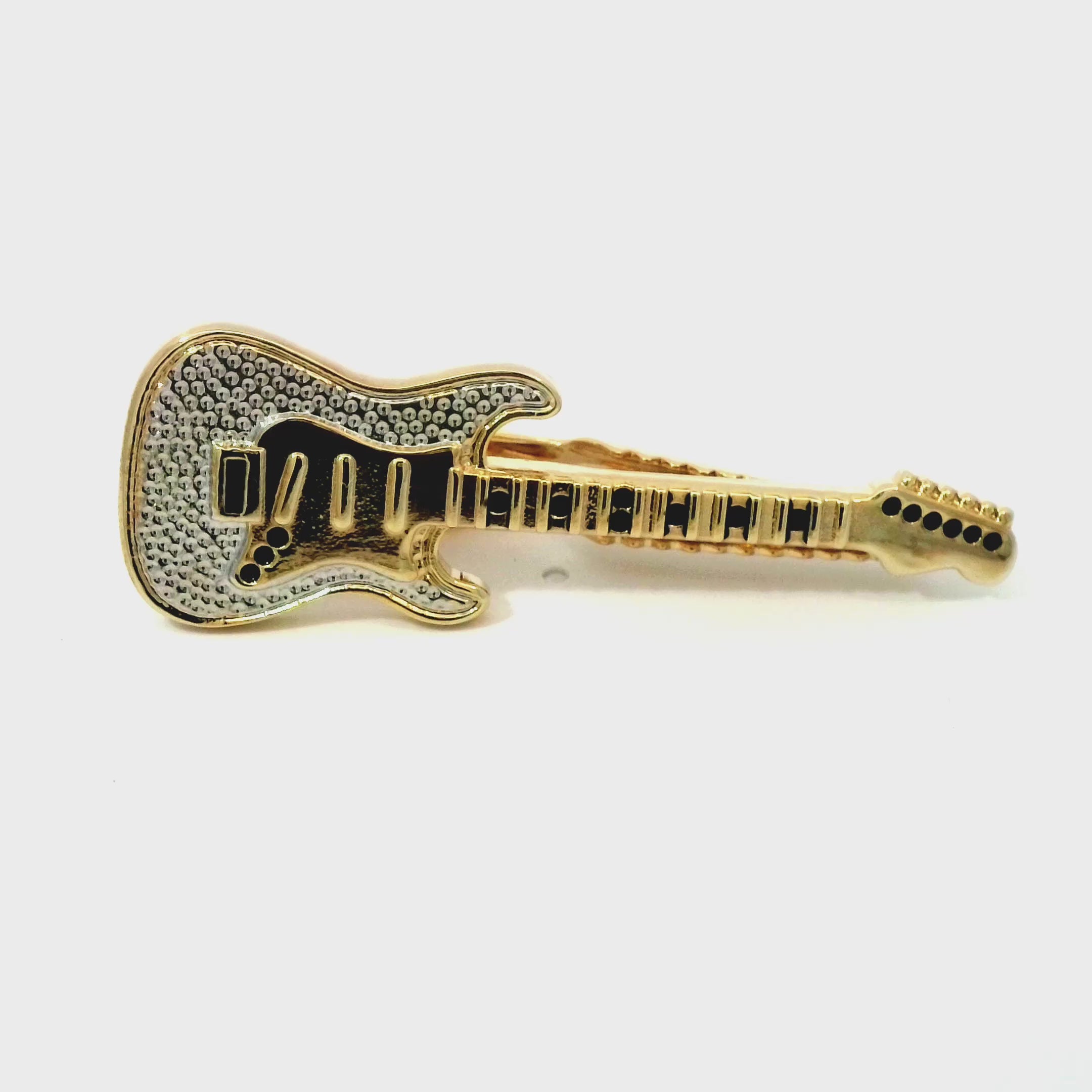 Rock your style with our Gold Guitar Tie Bar! This sleek and stylish tie bar features a detailed guitar design in gleaming gold, perfect for adding a touch of musical flair to any outfit. Finished in shiny rhodium that resists tarnishing and wear. Ideal for musicians and music lovers alike, it brings a unique and sophisticated touch to your look.