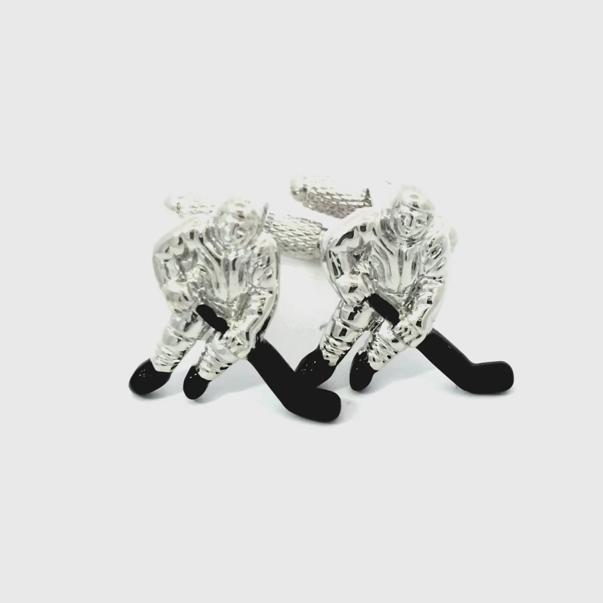 Show off your passion for the game with these Silver Hockey Cufflinks featuring sleek black details. Perfect for hockey enthusiasts. Add a winning touch to your outfit with this stylish nod to your favorite sport! Finished in shiny rhodium plating and black enamel details.