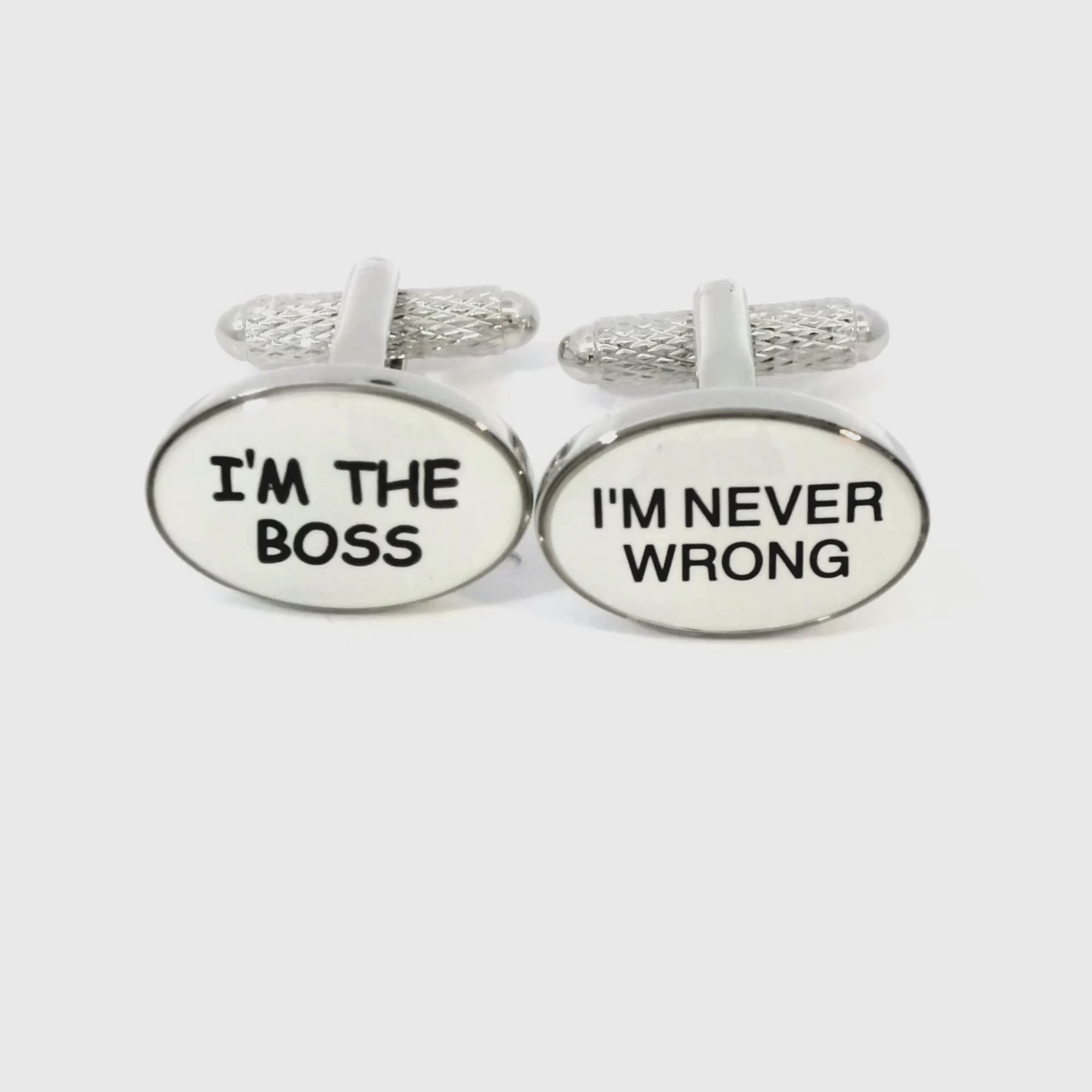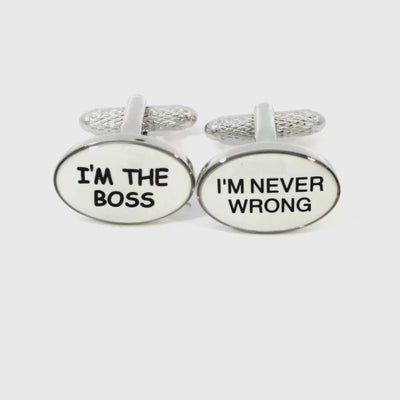 Make a confident statement with these I Am the Boss Cufflinks! Featuring the phrases "I'm the Boss" on one cufflink and "I'm never wrong" on the other, these white oval enamel cufflinks add a playful and assertive touch to any outfit. Finished in enamel and rhodium plating.