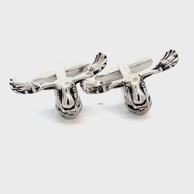 Embrace the spirit of the wilderness with these Moose Head with Horns Cufflinks. These cufflinks showcase an intricately detailed moose head with its iconic antlers, symbolizing strength, resilience, and natural beauty. Finished in shiny rhodium plating.