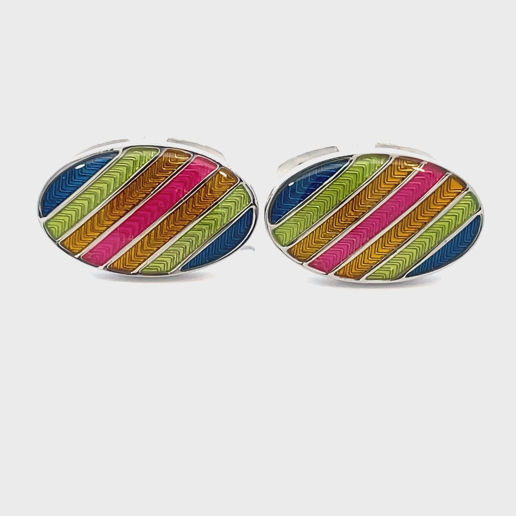 Add a bold splash of color to your formalwear with these Multicolour Striped Oval Cufflinks. Featuring a striking diagonal stripe pattern in vibrant shades of blue, green, pink, and orange, these cufflinks are designed to make a statement. Finished in enamel and shiny rhodium plating.