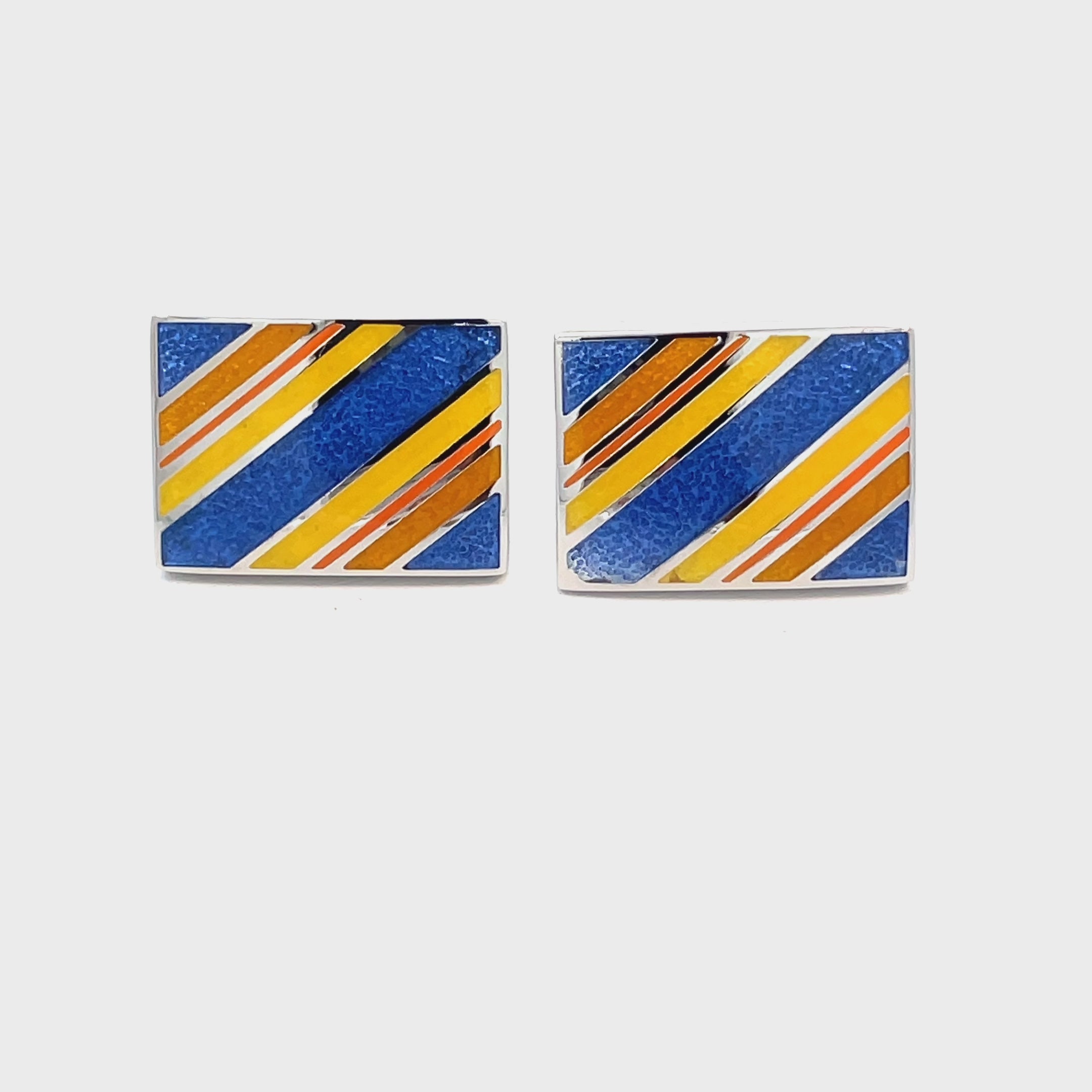Make a bold statement with these Multicolour Striped Rectangle Cufflinks. Featuring a dynamic diagonal stripe pattern in striking shades of blue, yellow, and orange. These cufflinks blend classic elegance with modern flair. Finished in enamel and shiny rhodium plating.