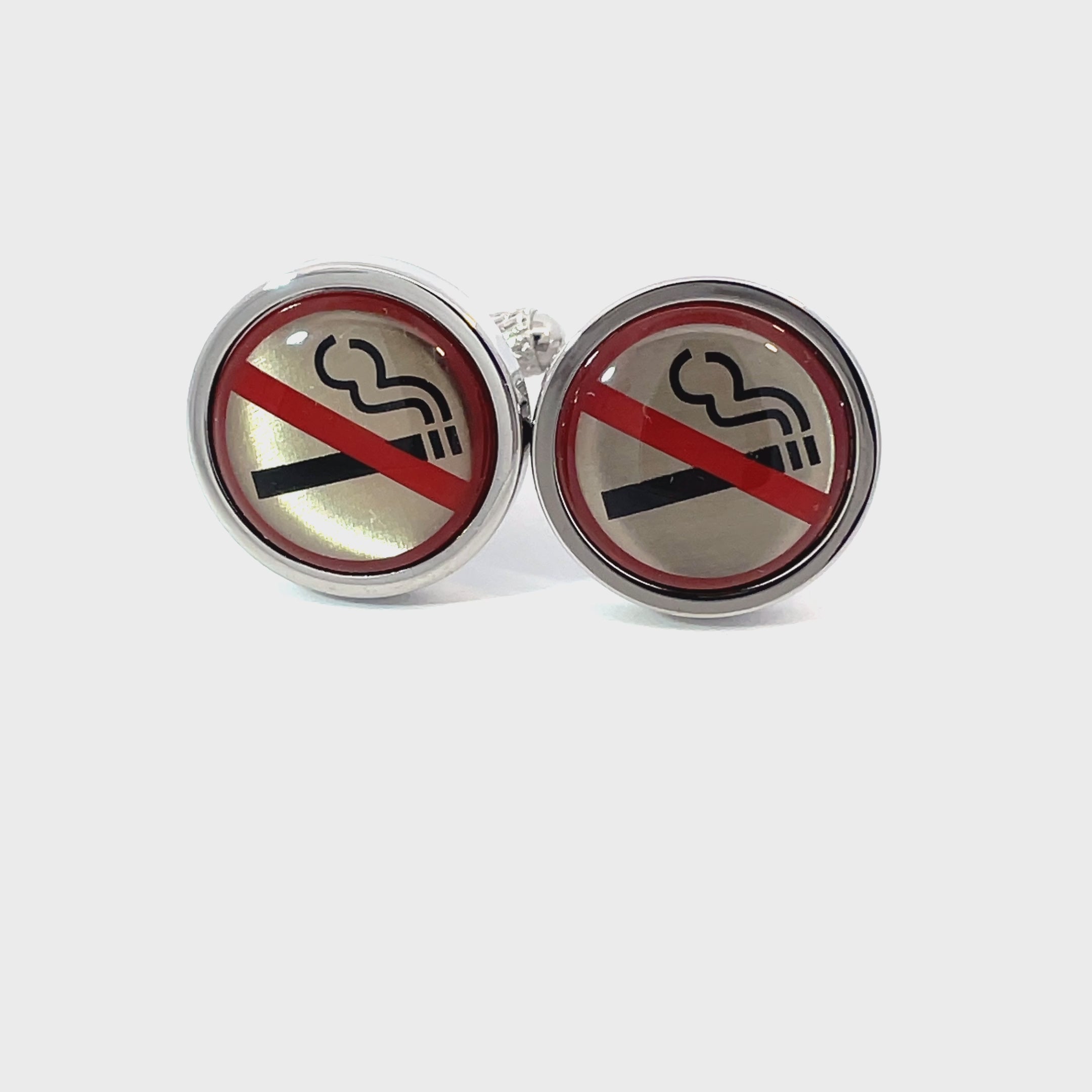 Featuring the universally recognised no smoking symbol in striking red, black, and silver tones, these round cufflinks are both eye-catching and meaningful. Encased in a glossy dome finish with a polished silver-tone frame. Finished in shiny rhodium plating.
