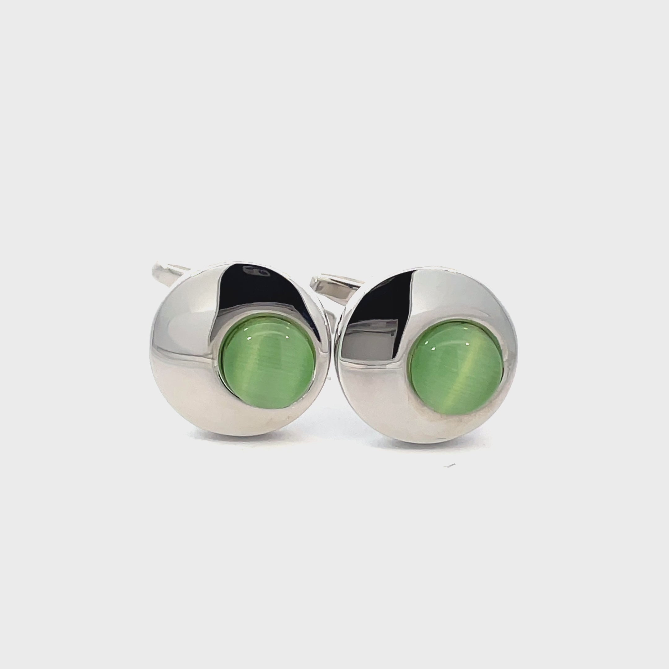 A circular cufflink feature on an off-centre green Catseye dome is very unusual and eye-catching. The rich green hue adds a pop of colour while maintaining an air of elegance. Finished in shiny rhodium plating.