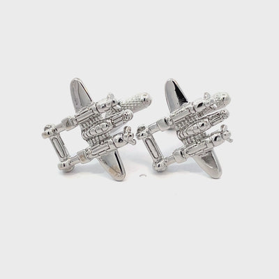 P38 Lightning Aircraft Silver Cufflinks in shiny silver. Made with exquisite attention to detail, they are the perfect accessory for aviation enthusiasts, veterans, or anyone with a passion for classic aircraft.