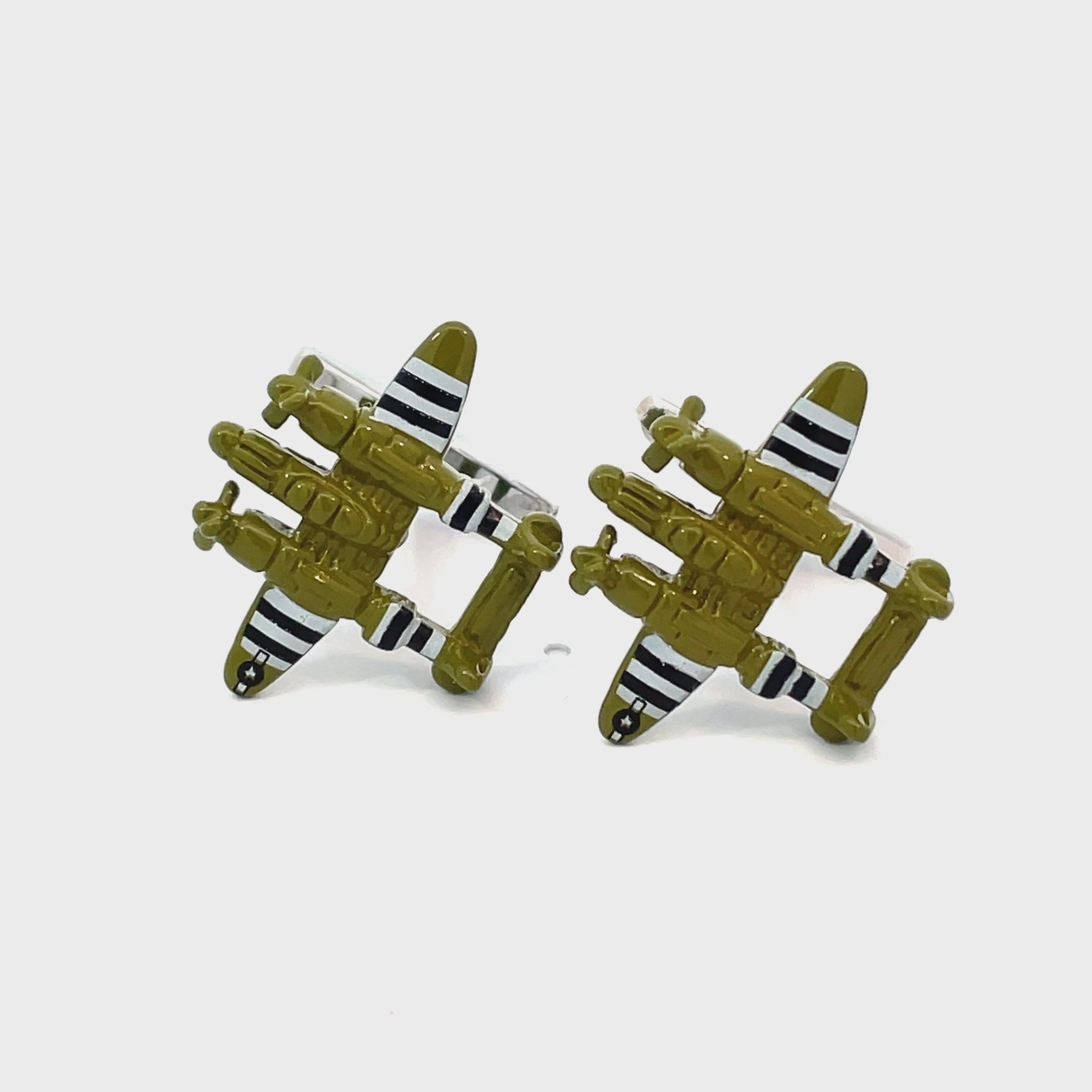 Inspired by the iconic P-38 Lightning fighter plane, these cufflinks capture the essence of aviation history and sophistication. Each pair is carefully designed with intricate detailing, making them a perfect accessory for aviation enthusiasts, veterans, or anyone with an appreciation for classic aircraft. Finished in enamel and shiny rhodium plating.