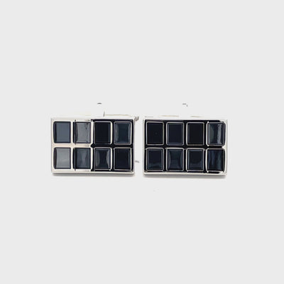 Add a sharp, contemporary edge to your look with the Panels of Black Cufflinks. Featuring a polished silver-tone frame set with sleek black rectangular panels, these cufflinks offer a modern geometric design that pairs effortlessly with any formal ensemble. Finished in enamel and shiny rhodium plating.