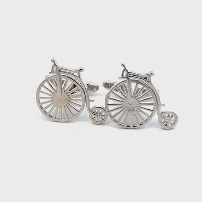 Add a vintage twist to your ensemble with these Penny Farthing Bicycle Cufflinks. Crafted in polished silver-tone metal, the design showcases the iconic large front wheel and tiny rear wheel of the classic 19th-century bicycle. Finished in shiny rhodium plating.