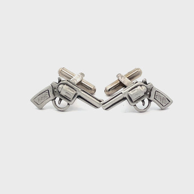 Make a bold statement with these Pewter Revolver Cufflinks, designed for the sharp-dressed renegade. Featuring finely detailed six-shooter pistols with textured grips, these cufflinks add a rugged, adventurous touch to any formal outfit. Ideal for collectors, Western fans, or anyone with a wild side.