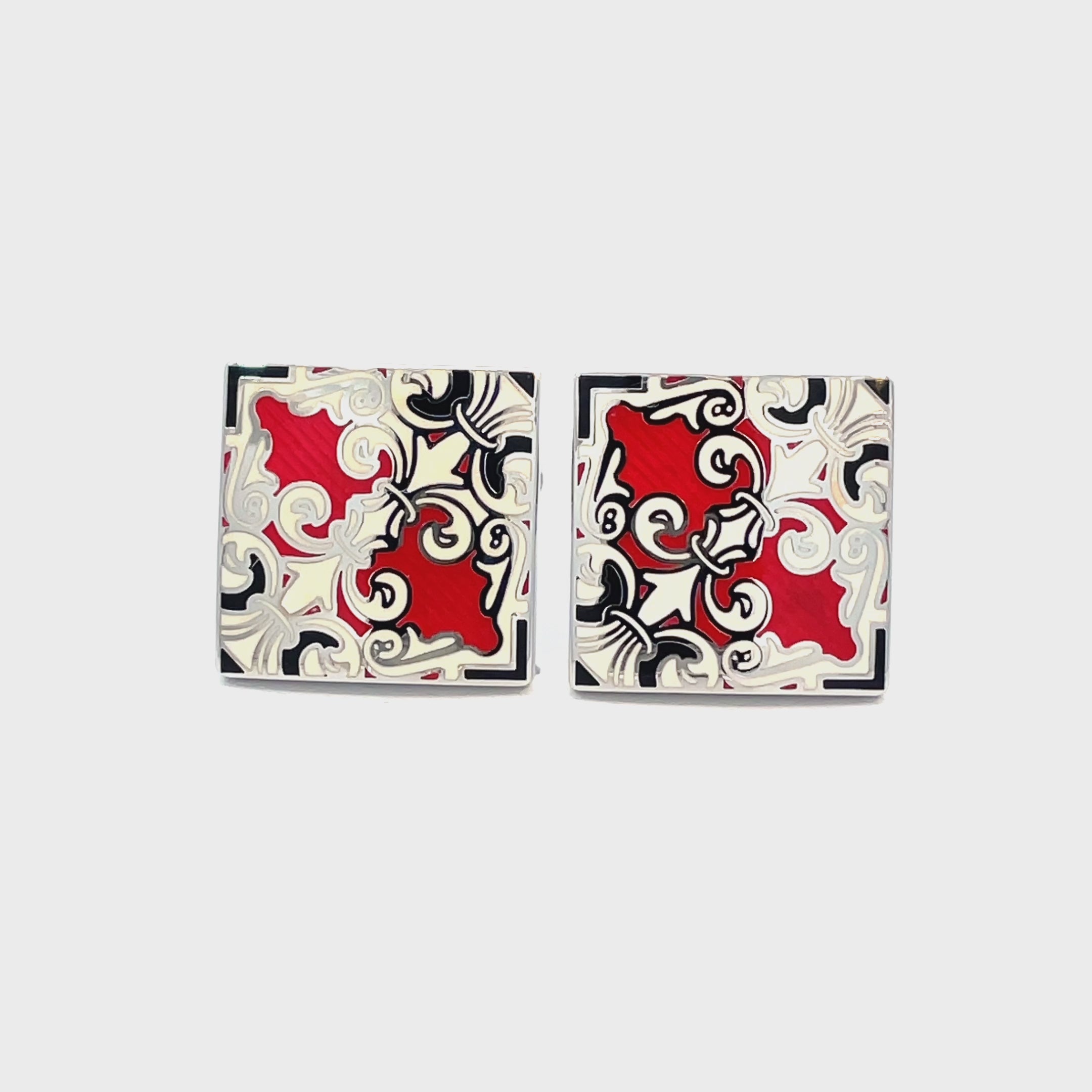 Channel old-world grandeur with these Renaissance Cufflinks, featuring an ornate design in bold red, black, and silver. A true statement piece, perfect for adding a regal flourish to formalwear or showcasing your appreciation for classic art and architecture. Finished in enamel and shiny rhodium plating.
