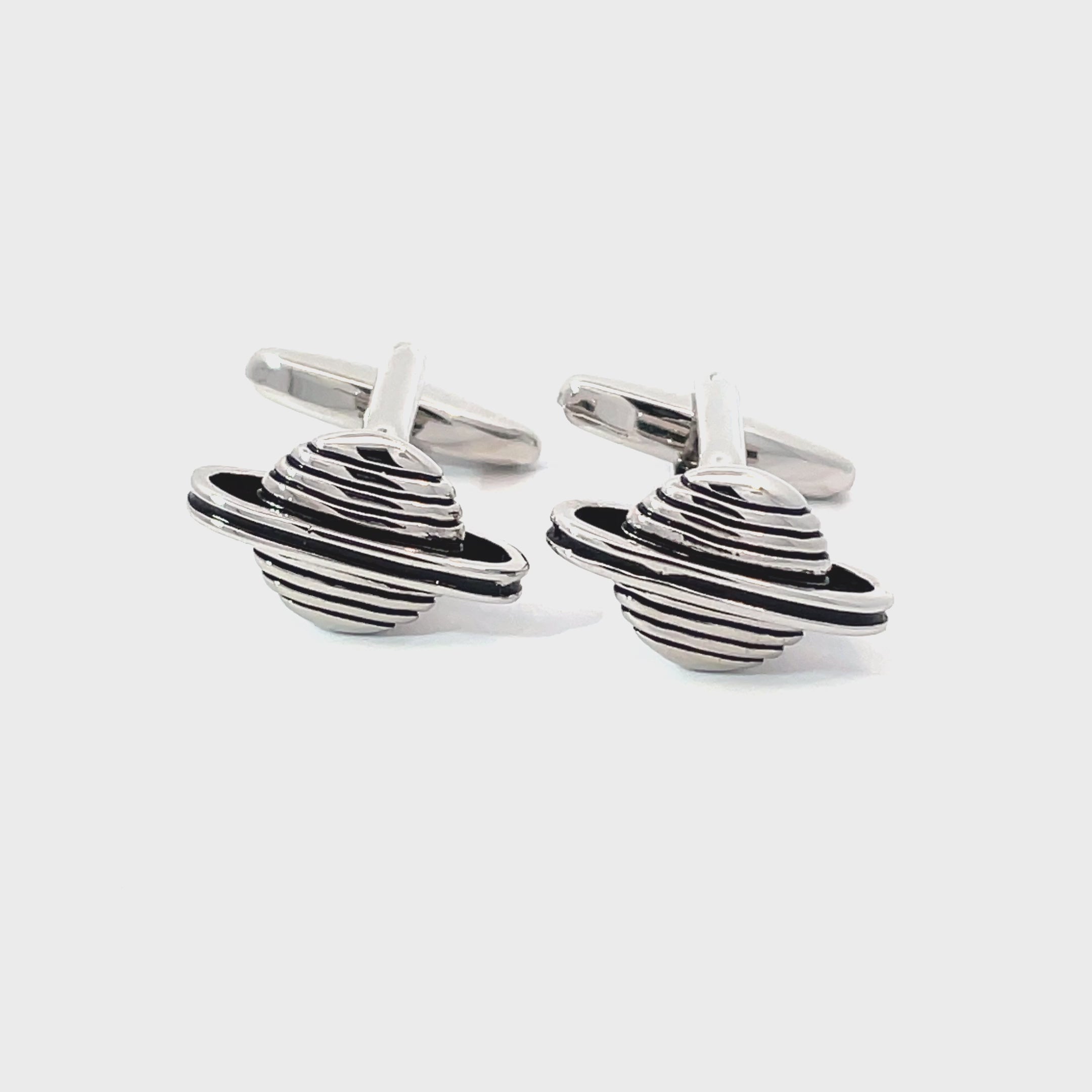 Out-of-this-world style! These silver-tone cufflinks feature a detailed, striped Saturn design complete with iconic rings. Bold yet elegant, they’re perfect for space lovers, stargazers, or anyone wanting to add a cosmic touch to their cuff. Finished in shiny rhodium plating.