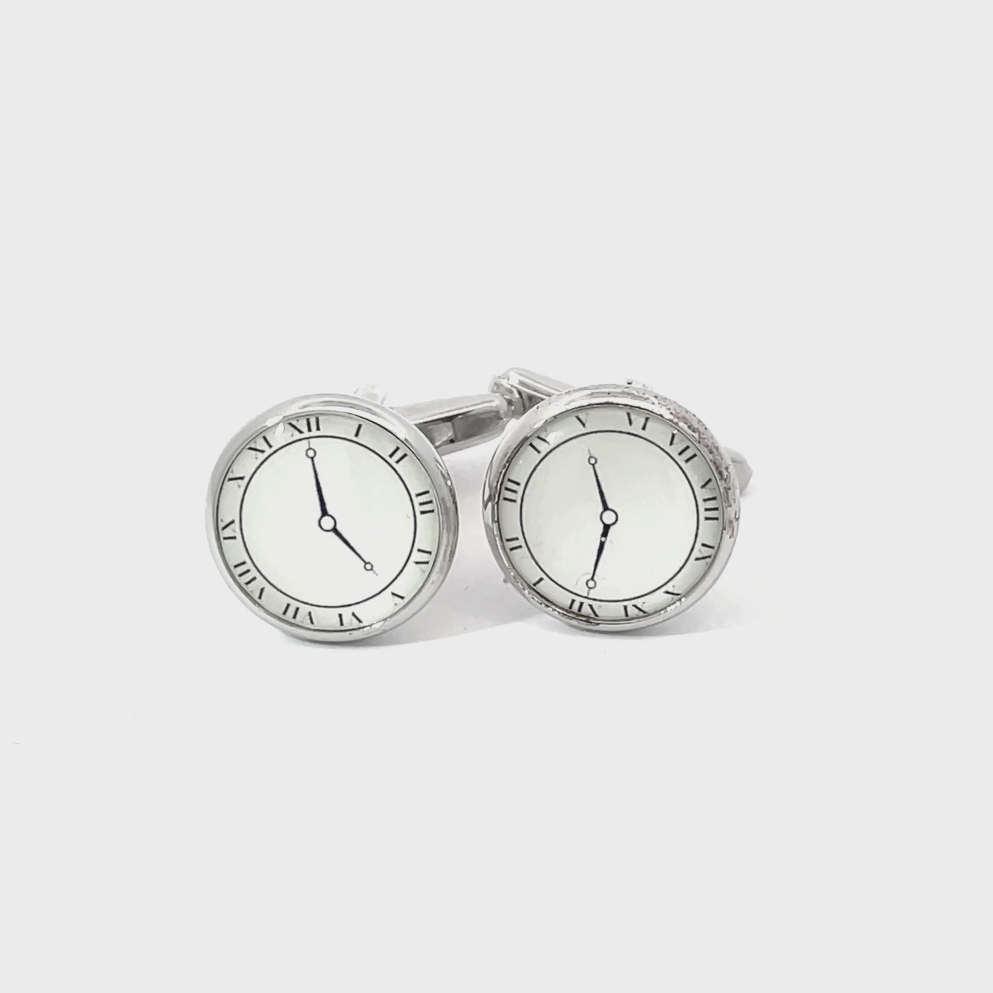 Timeless elegance meets classic design with these silver-toned cufflinks featuring a detailed clock face with Roman numerals. The white enamel dial adds a refined contrast, making them ideal for the punctual gentleman or vintage enthusiast looking to add old-world charm to formalwear. Please note that they are not a working clock. Finished in enamel and shiny rhodium plating.