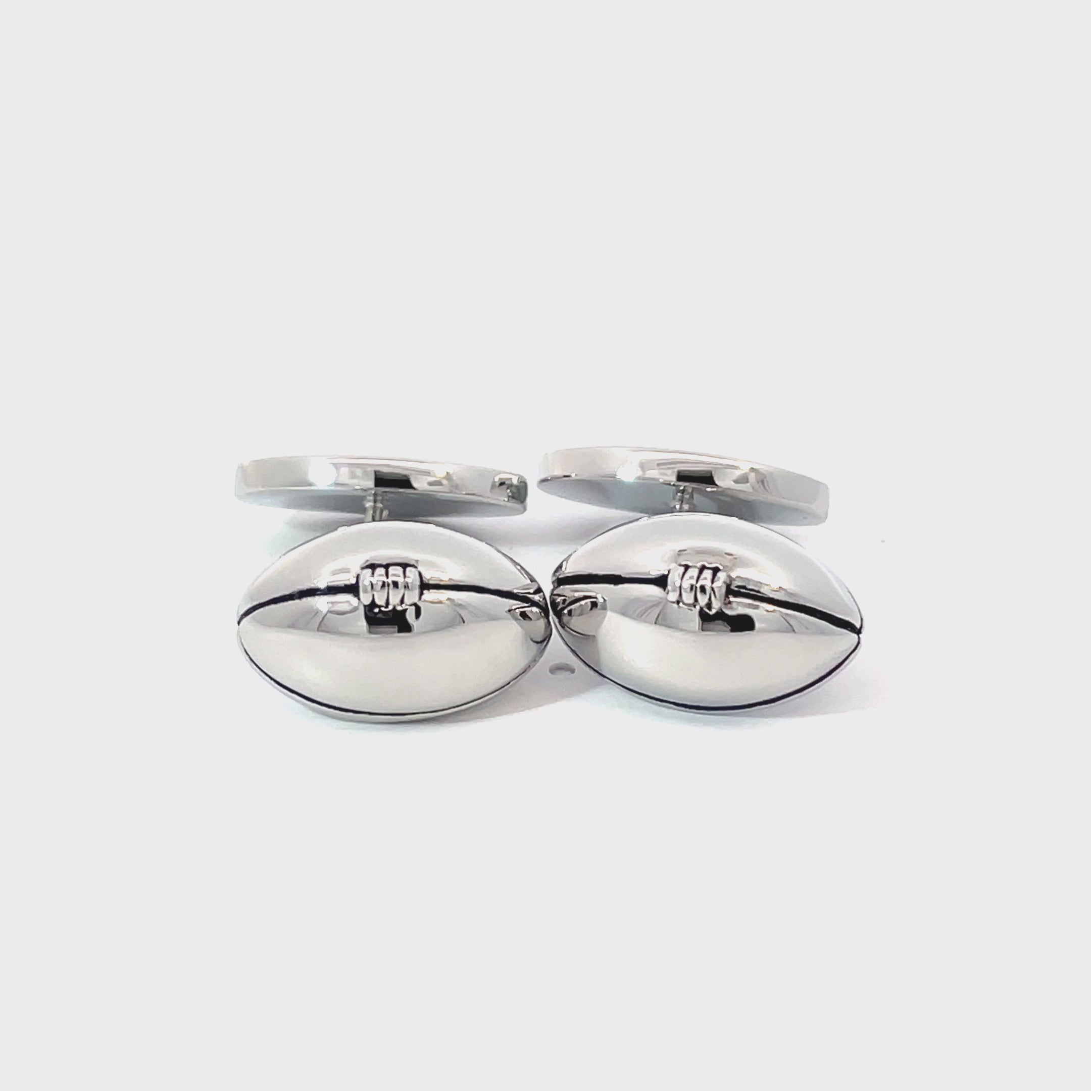 Score style points with these silver-plated rugby ball cufflinks. Featuring a sleek polished finish and detailed lacing, they’re the ideal gift for rugby lovers who appreciate sharp dressing with a sporty twist. They have a chain fitting with a flat panel at the back for the opposite side of the sleeve.