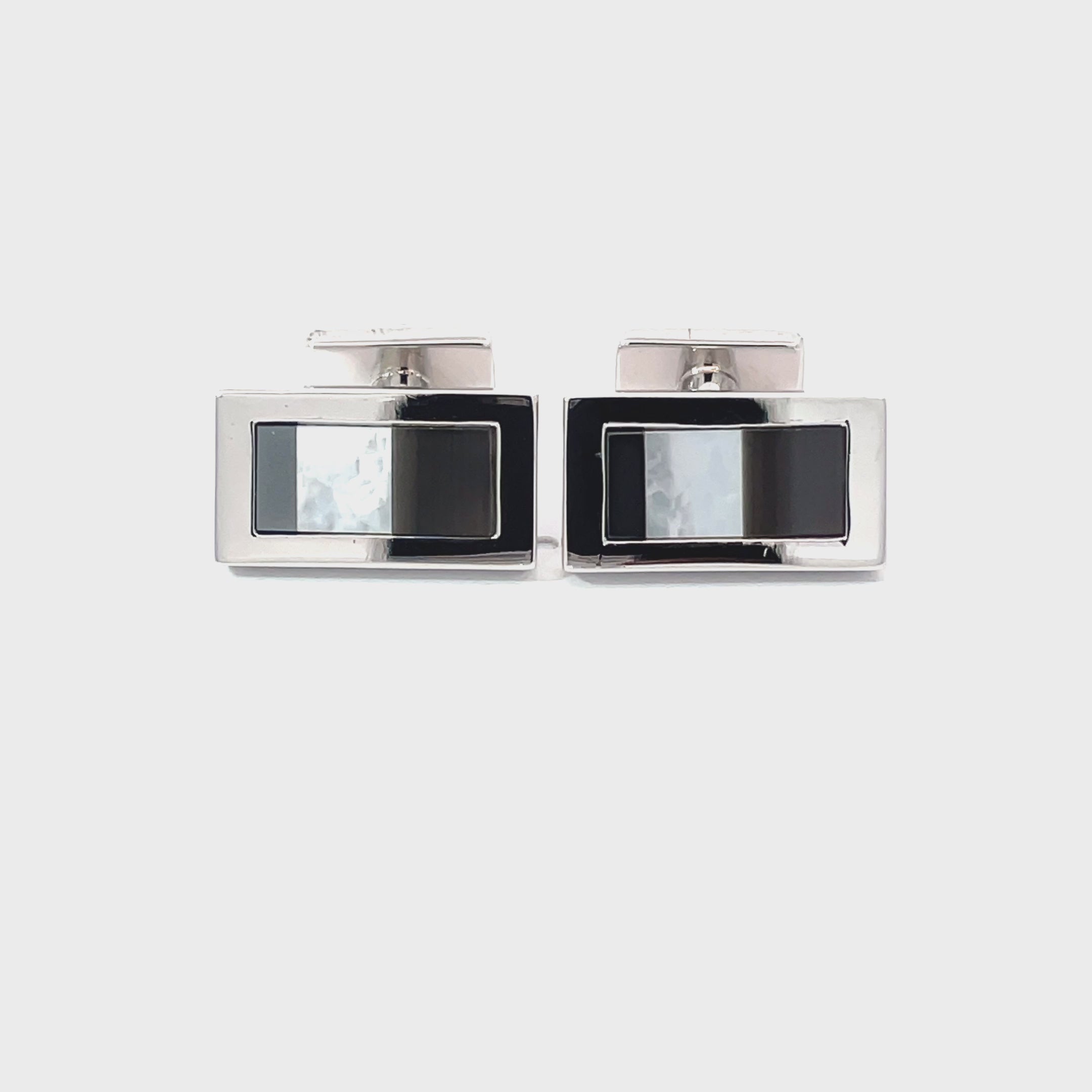 Sleek and understated, these rectangular cufflinks feature one black glass inlay and one translucent white oval insert on the backing. A minimalist yet distinctive design that pairs perfectly with both business and formal attire. Finished in shiny rhodium plating.