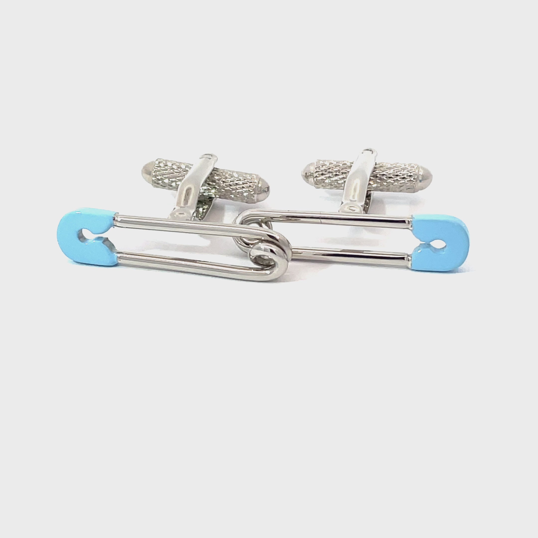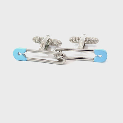 These silver-tone cufflinks feature a playful safety pin design with light blue enamel tips. A quirky accessory that adds a fun twist to any formal outfit—perfect for new dads or anyone with a cheeky sense of style. Finished in enamel and shiny rhodium plating.