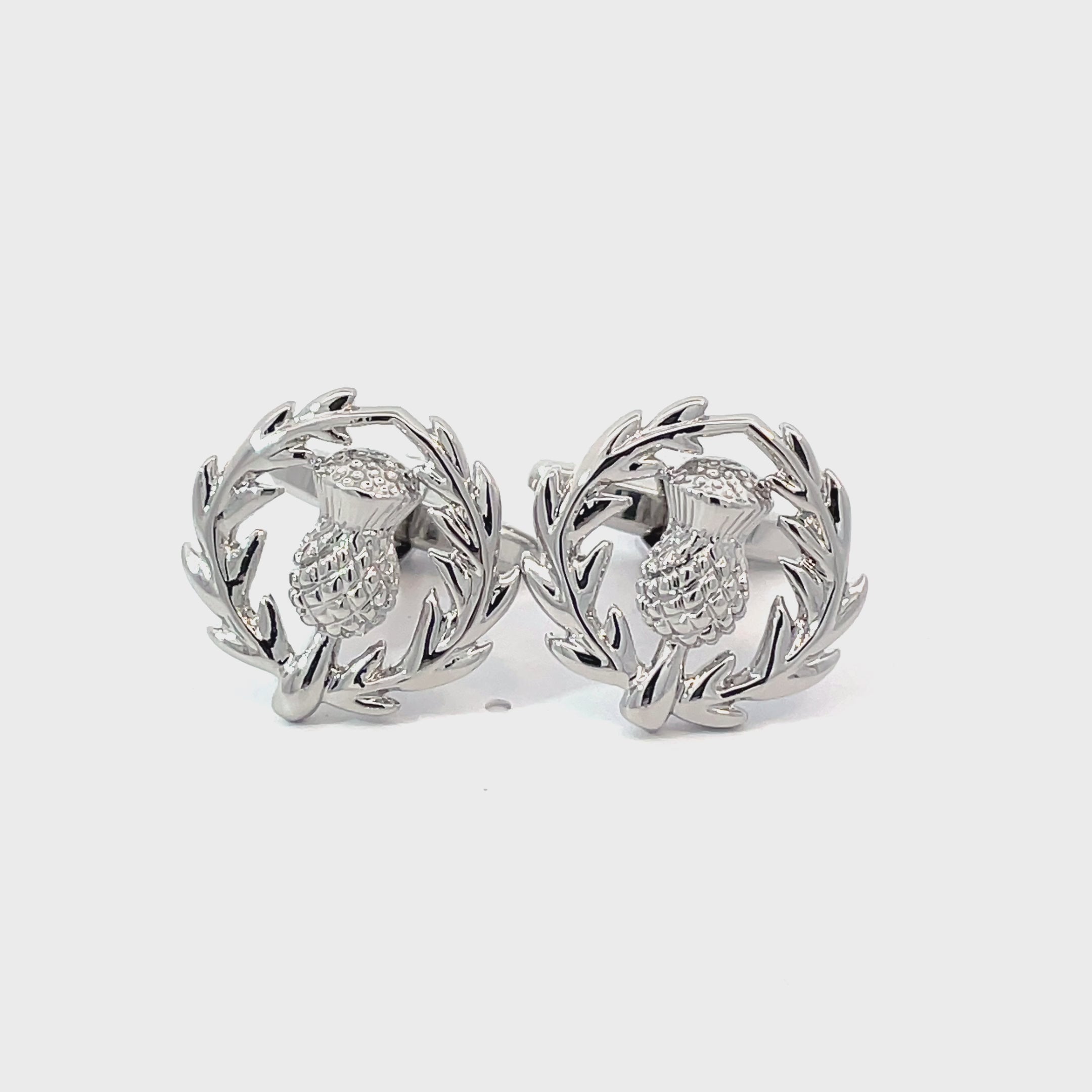 Celebrate your heritage with these finely crafted Scottish Thistle (Round) Cufflinks. Featuring the iconic national flower of Scotland encircled by a laurel wreath, these silver-toned cufflinks are a subtle yet proud nod to Scottish pride and tradition. Perfect for Highland dress, formal events, or thoughtful gifting. Finished in shiny rhodium plating.