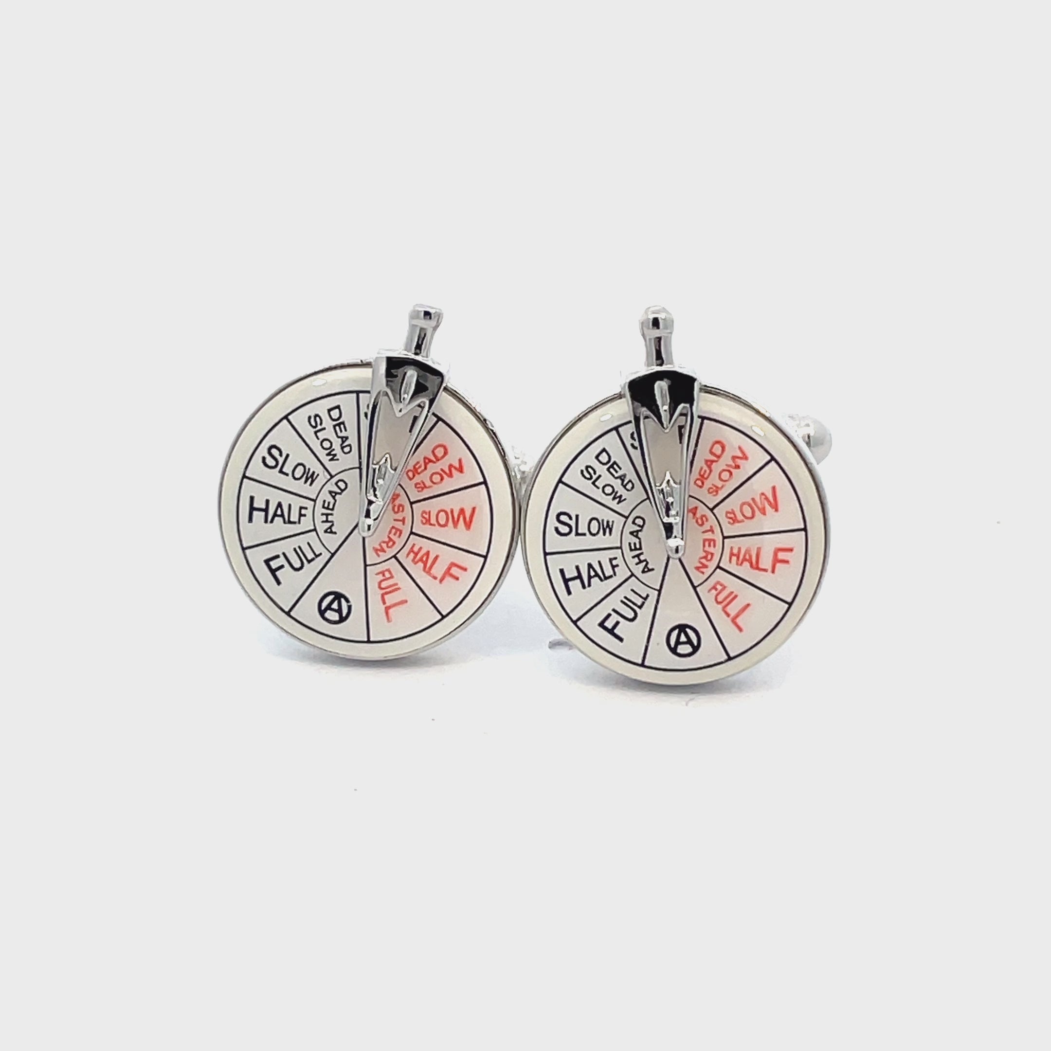 Set sail in style with these Ship Telegraph Cufflinks featuring a classic engine order telegraph design. The handle and bold black and red lettering capture the charm of vintage maritime controls. A perfect gift for nautical enthusiasts, sailors, or lovers of unique statement pieces. (Handle does not move) Finished in enamel and shiny rhodium plating.