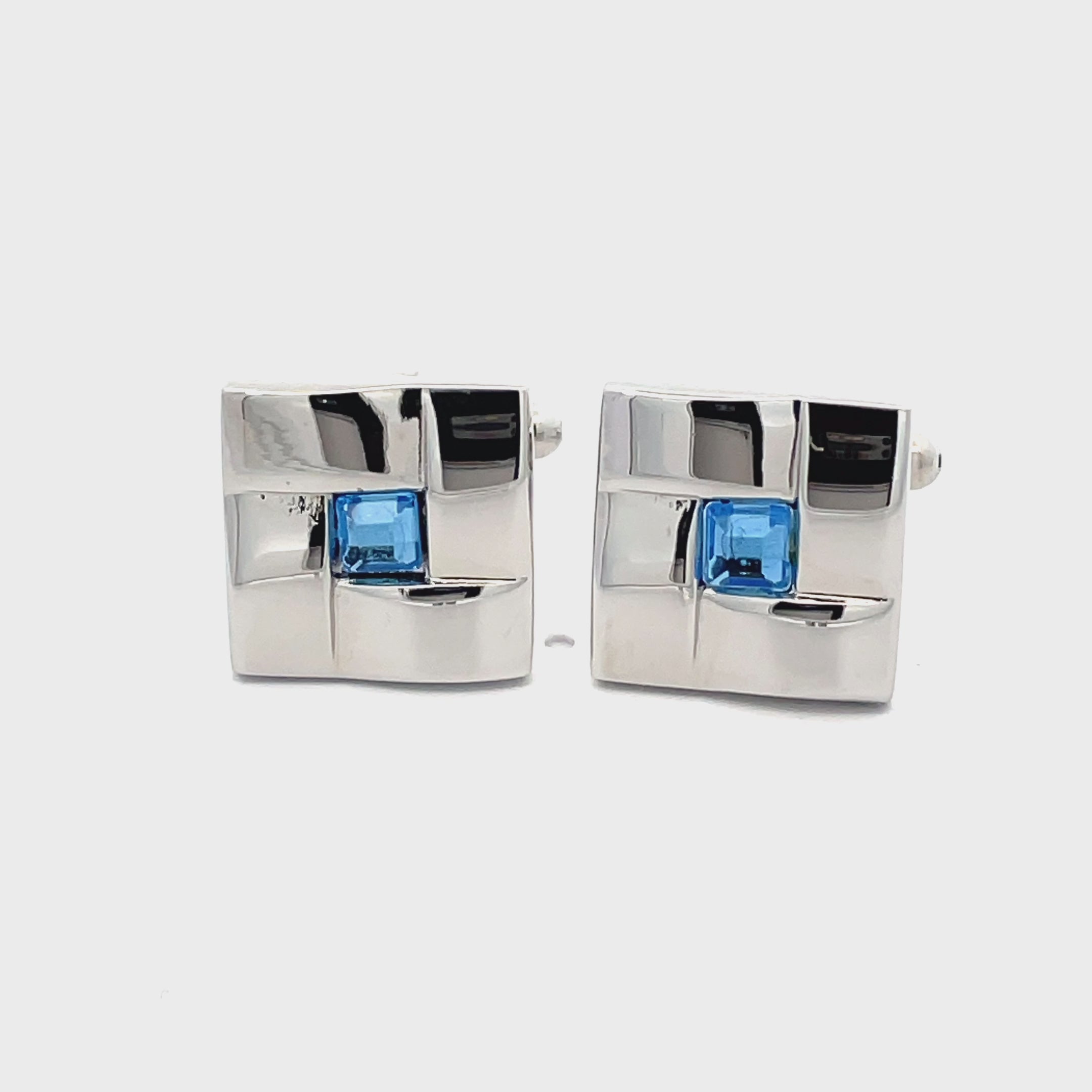 Modern and refined, these Sky Blue Weave Cufflinks feature a textured silver-tone grid accented with a striking blue crystal at the center. The sculpted design adds depth and dimension to your formalwear. A sleek choice for weddings, business attire, or evening events. Finished in shiny rhodium plating.