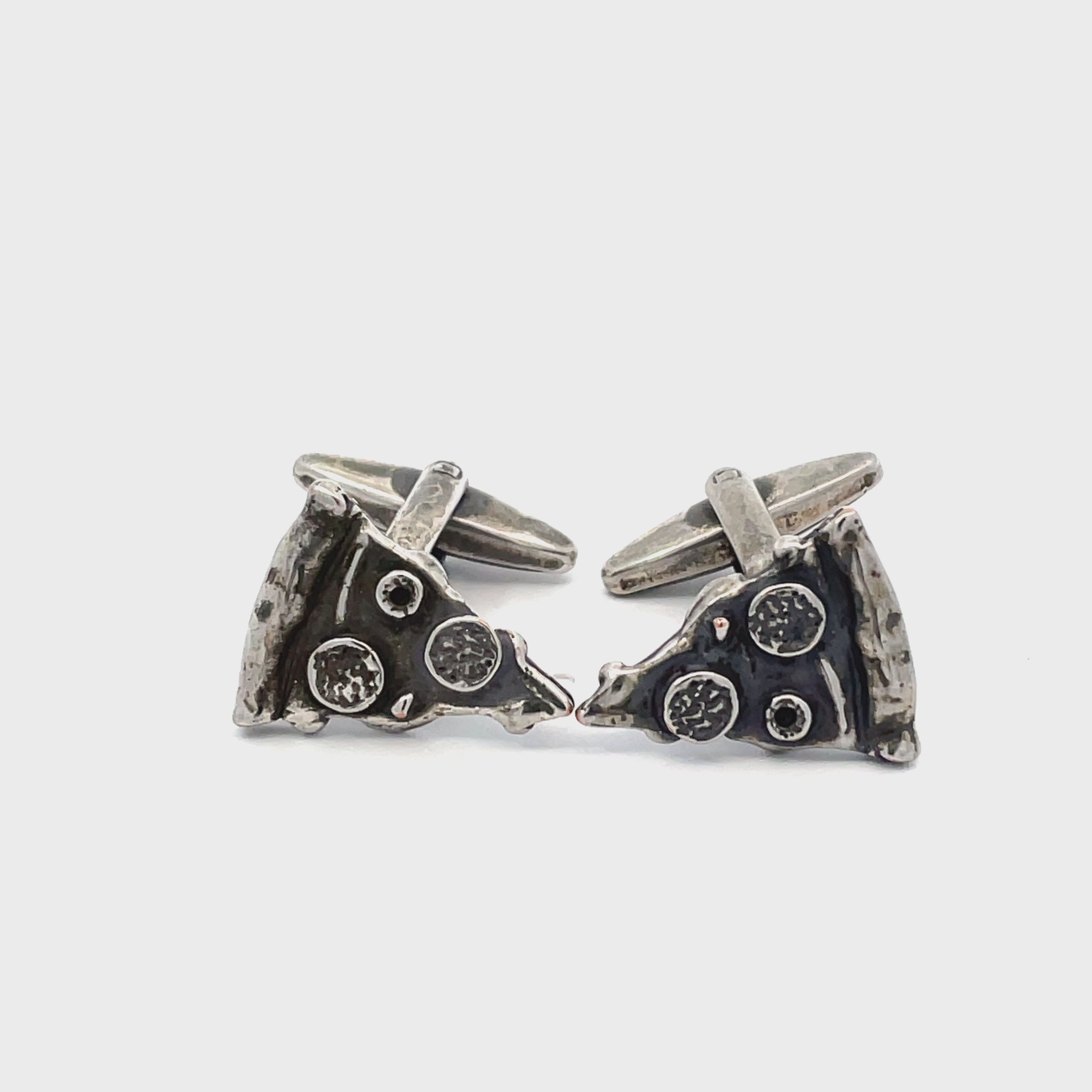 Bring a bit of fun to your formalwear with these Slice of Pizza Cufflinks. Featuring a cheeky pizza-slice design with textured detailing, they’re the perfect accessory for food lovers and anyone who likes their style with a sense of humour. Ideal for parties, weddings, or as a unique gift. Finished in antique rhodium plating.