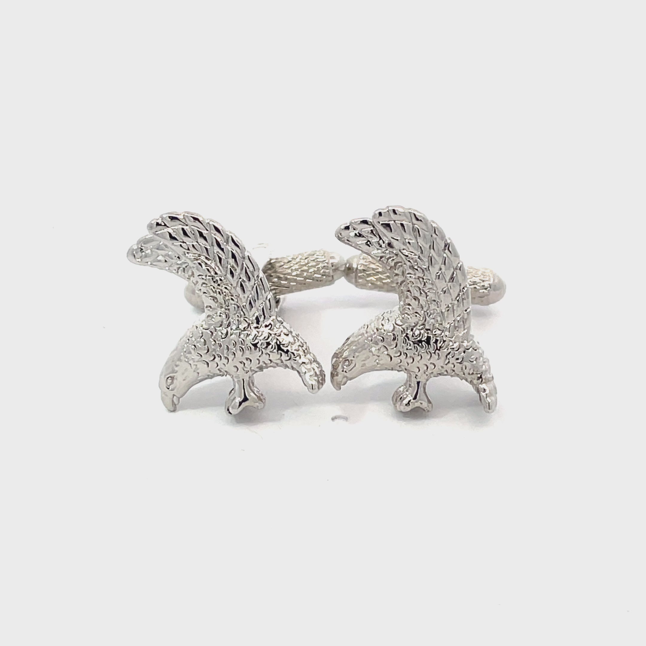 Make a powerful statement with these Soaring Eagle Cufflinks. Featuring a finely detailed eagle in flight with a polished silver-tone finish, they capture strength, freedom, and sharp style in one striking accessory. Perfect for formal events, business wear, or as a meaningful gift for someone who likes to stand out. Finished in shiny rhodium plating.