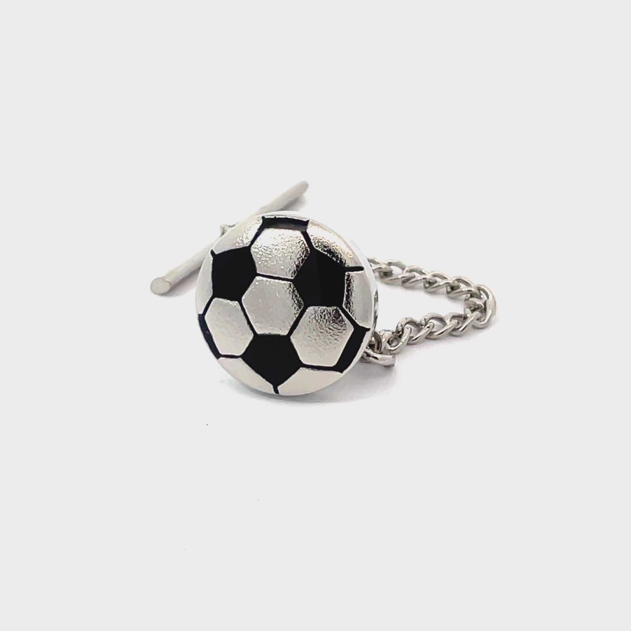 Show your love of the game with this Soccer Ball Tie Pin. Featuring a classic black-and-white football design with a polished silver-tone finish, it adds a sporty touch to any tie. Complete with a secure chain and T-bar fastening, it’s perfect for match days, formal events, or as a great gift for any soccer fan. Finished in shiny rhodium plating.